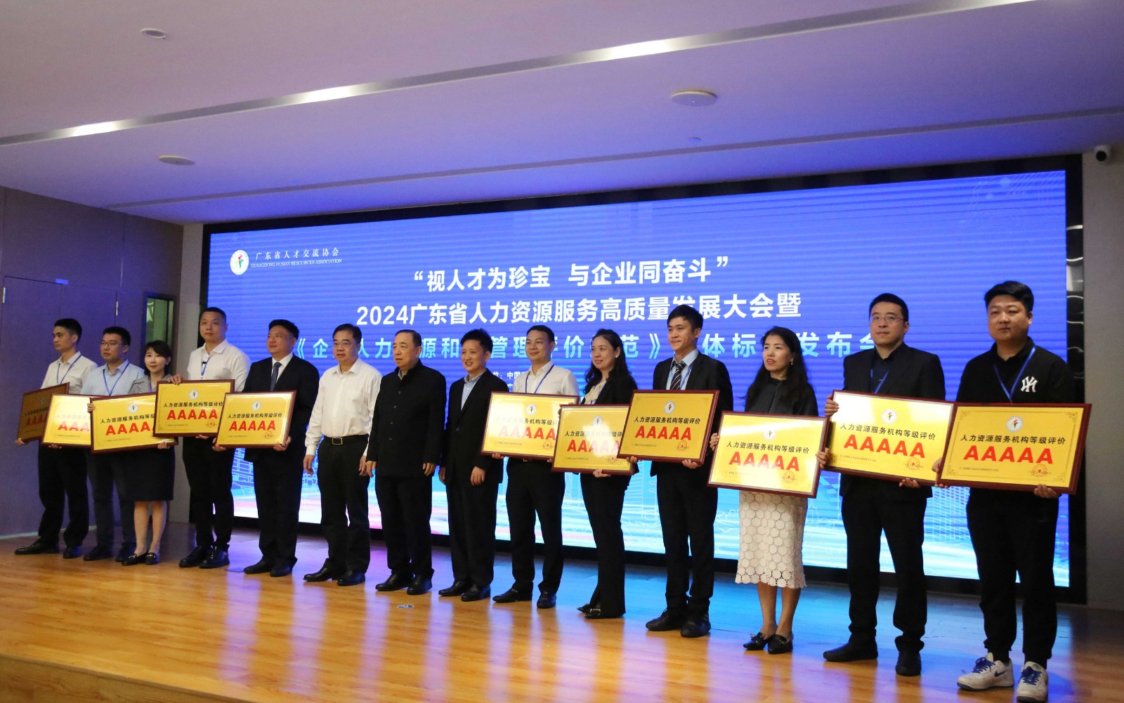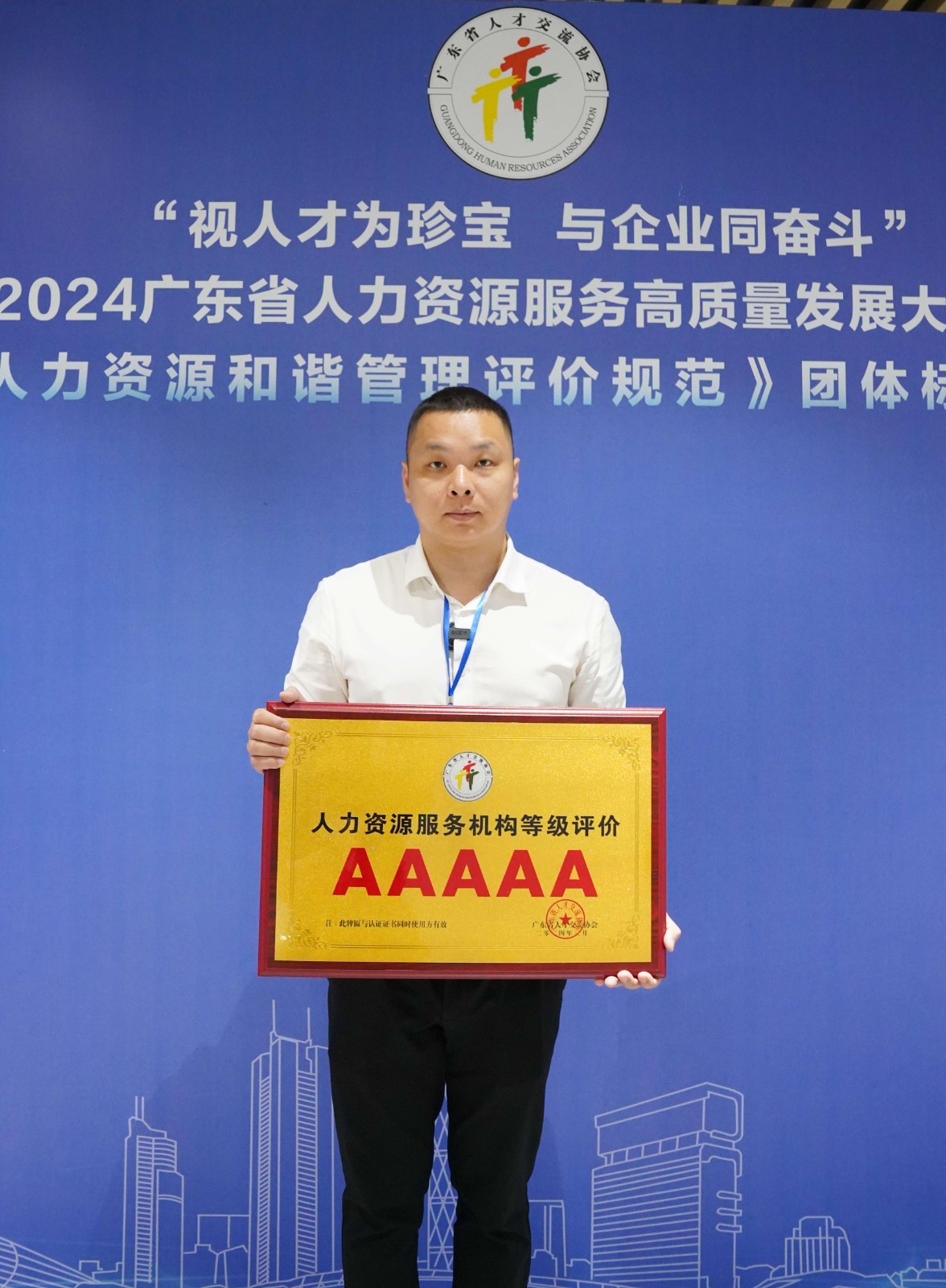2024年3月29日上午,粤港澳大湾区(广东)人才港迎来了一场盛大的活动——“视人才为珍宝,与企业同奋斗”2024广东省人力资源服务高质量发展大会暨《企业人力资源和谐管理评价规范》团体标准发布会。欢创集团董事长罗宁弟受邀出席了本次盛会,并代表集团接受了人力资源服务机构等级评价的最高荣誉——5A牌匾。